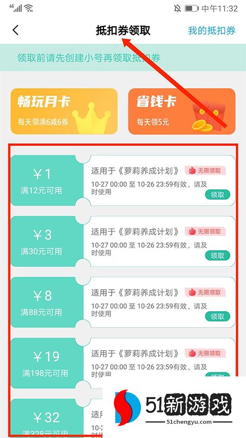 6、在【折扣券】界面,可领取该游戏的代金券,进行消费充值的时候可以抵扣现金。