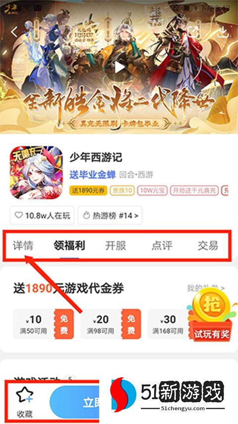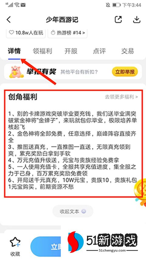 4、进入相应的游戏界面,包括“详情”、“领福利”、“开服”、“点评”、“交易”以及下方的“收藏”、“下载”和“点评”等选项,首先选择“详情”。