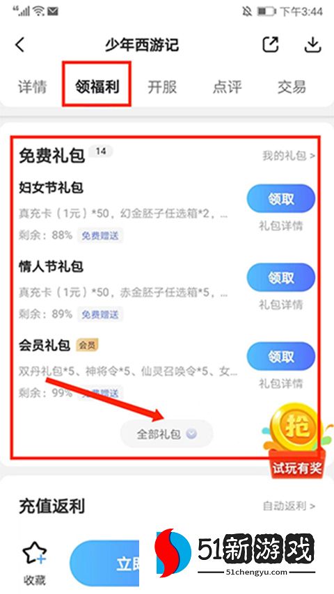 1、进入【领福利】界面,包括不同类型的礼包和进行选择领取,选择“全部礼包”还有更多礼包在等着你。