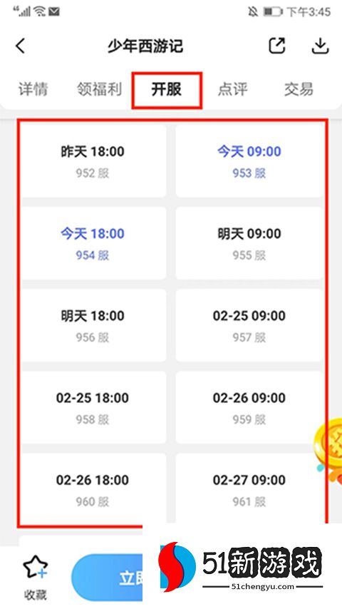 3、进入【开服】界面,可看到游戏的开服时间和开服名称。