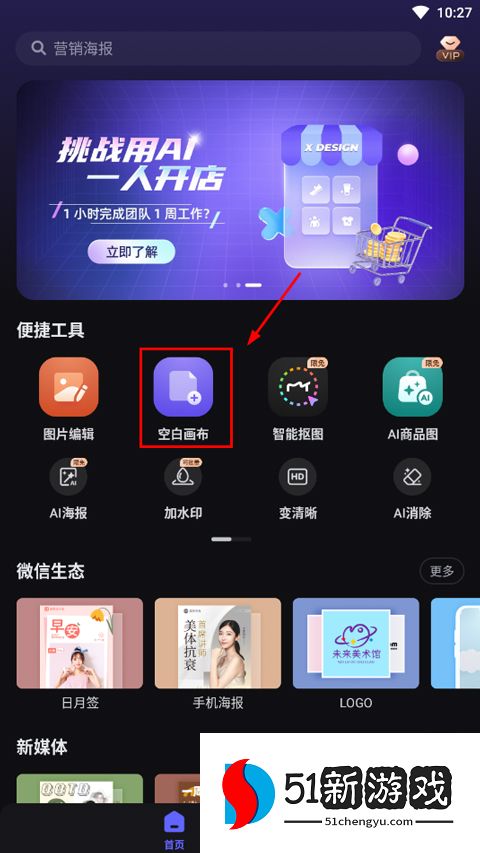 1、打开美图设计工作室应用程序,点击空白画布。