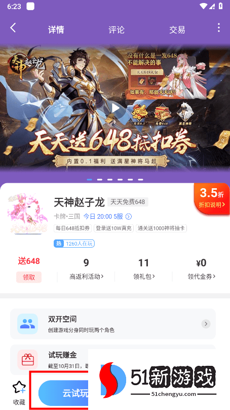 3、在游戏详情页,可以看到试玩游戏的福利,点击云试玩或者立即下载,就可以体验游戏了。