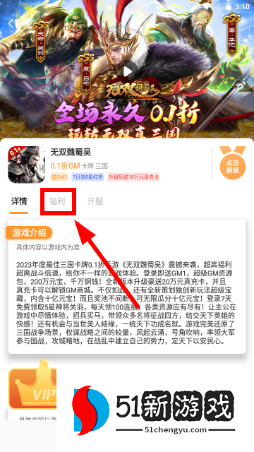 2、我们可以点击自己想玩的游戏,来到游戏简介页面,然后点击福利。