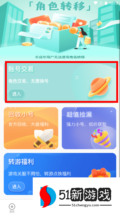 2、我们点击软件下方的交易,然后回来到交易界面,再找到账号交易,或者还有各种关于转游的功能大家可以打开看看。
