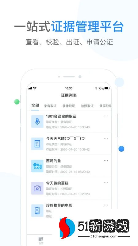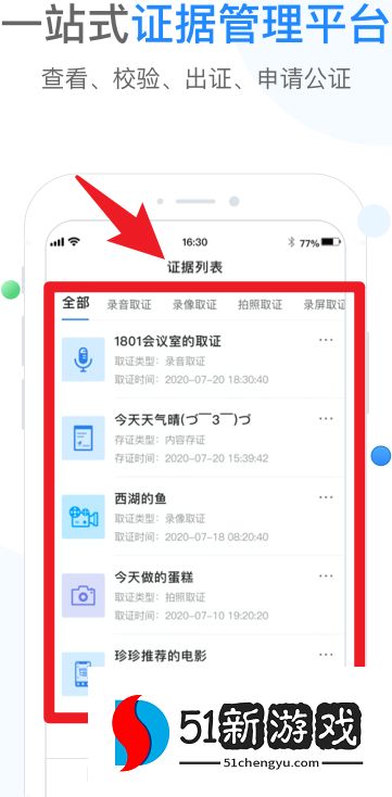 5、在“证据列表”中,可以统一管理所有取证与存证记录,支持查看、校验、出证及申请公证。