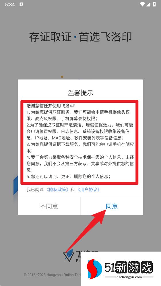 1、首次打开飞洛印时,请认真阅读并同意《用户协议》和《隐私政策》,点击“同意”进入。
