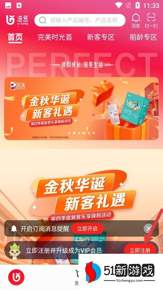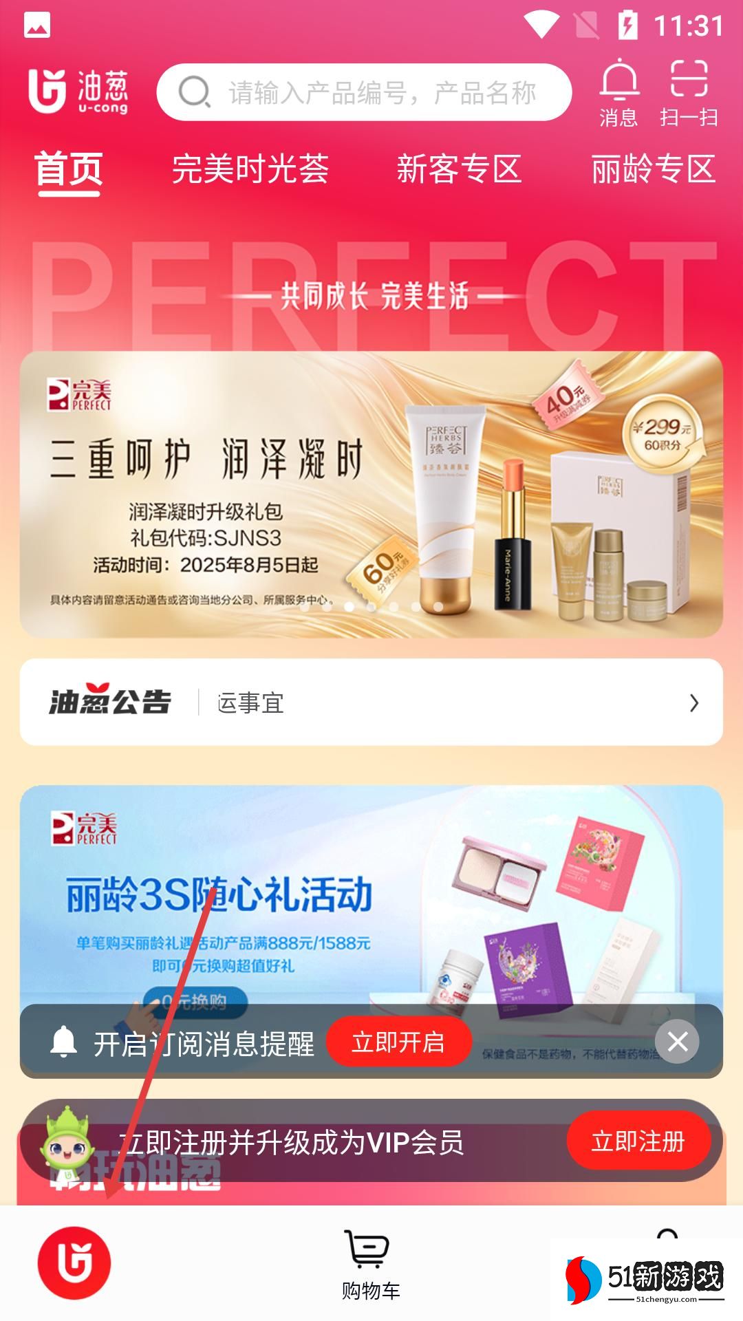 1、打开软件,有完美润泽凝时礼包、丽龄3S活动等推广,底部设购物车,我的等入口,可开启购物之旅。
