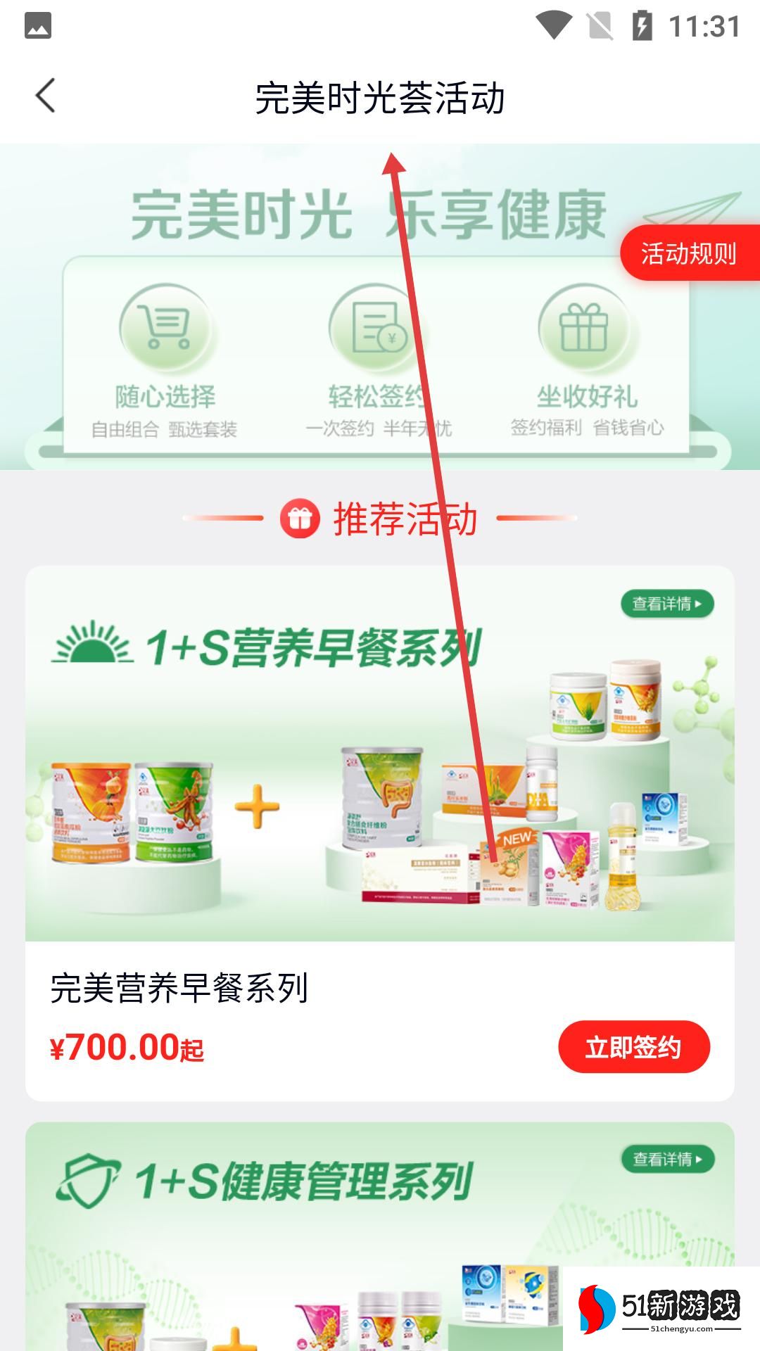 2、进入完美时光荟活动页,呈现完美时光,乐享健康主题,有营养早餐等推荐活动,可按需签约选购。