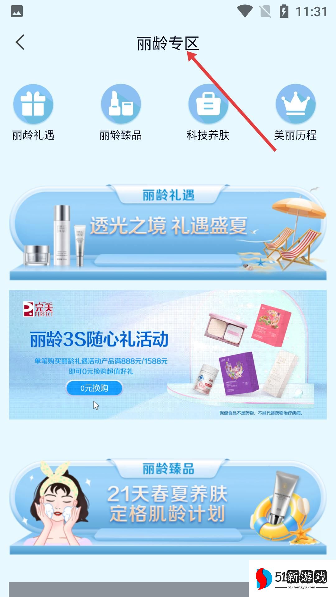 3、丽龄专区页面,含丽龄礼遇、臻品等板块,有透光之境活动、3S随心礼等,可参与0元换购享福利。