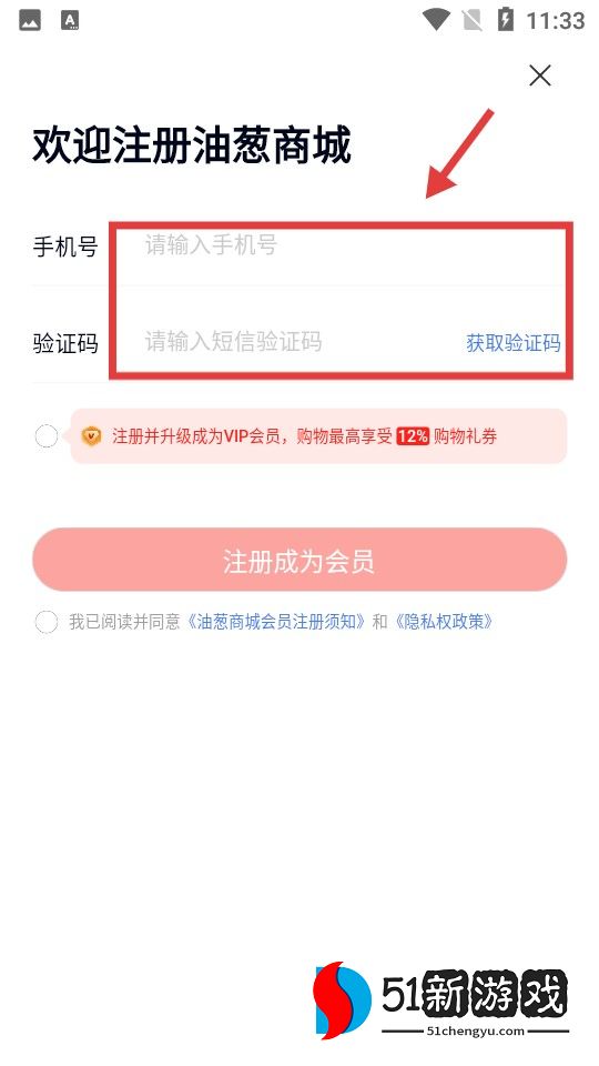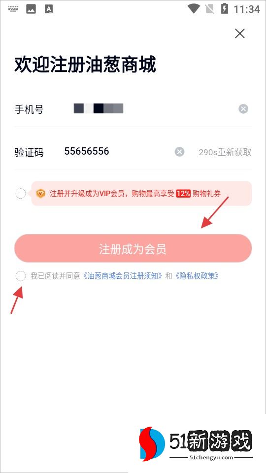 4、勾选同意《油葱商城会员注册须知》和《隐私权政策》,点击【注册成为会员】。