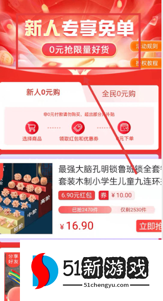 2、新人专享免单活动区,0元抢限量好货醒目呈现,选商品、领券后可0元下单,像孔明锁套装等,新人轻松薅羊毛。