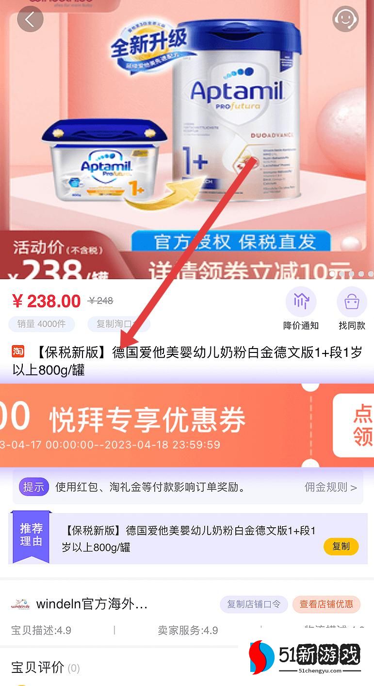 1、商品详情页展示德国爱他美婴幼儿奶粉信息,含活动价、销量等,点击标题可查看更全介绍,还能领券下单享优惠,助力宝妈选奶粉。
