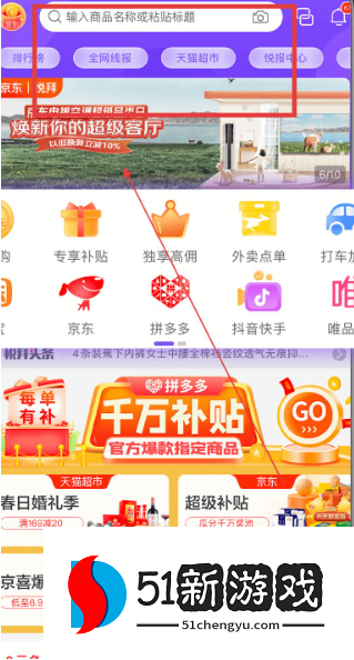 3、APP首页顶部搜索栏,支持输入商品名,粘贴标题搜好物,还有全网线报等标签,点对应区域,快速找优惠、进特色频道。