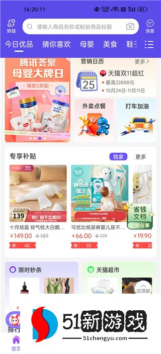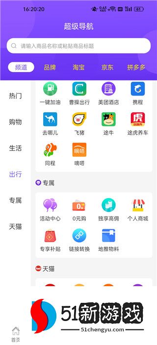 2、导航栏提供购物、生活、出行、专属及天猫超级导航等分类入口。