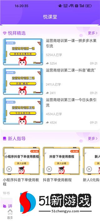 3、"悦课堂"板块包含新人操作指南和引流课程,可供用户免费学习。