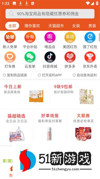 1、淘宝页有新人免单等功能入口,展示今日上新等板块,有猫超精选等分类,可搜索淘宝商品隐藏优惠券和佣金。