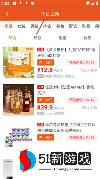 3、今日上新页展示天猫新品,如儿童口服液等,标注价格、优惠券及预估佣金,可按综合、销量、价格排序。