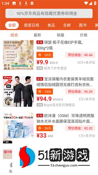 2、京东页展示居家日用等分类商品,如护手霜等,标注价格、优惠券及预估佣金,可按综合、销量、价格排序。