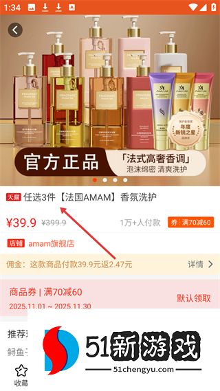 4、商品详情页面,以法国AMAM香氛洗护为例,展示价格、销量及佣金信息,有满减优惠券,可分享赚佣金或下单返佣金。