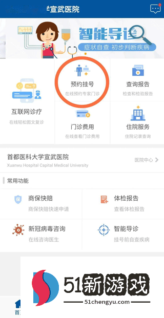 1、绑定就诊人后,在“首页”点击“预约挂号”;