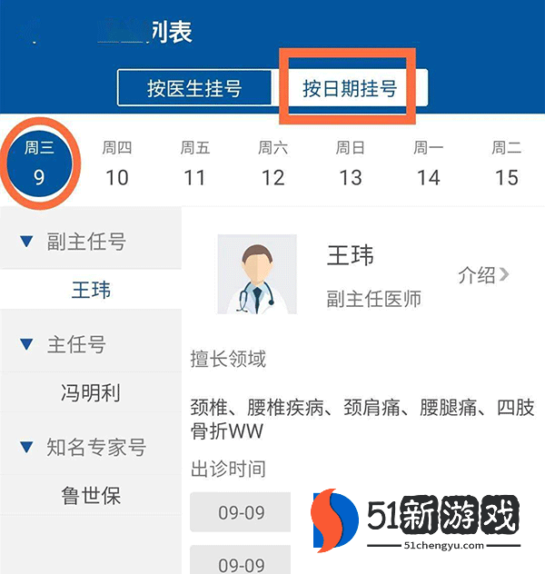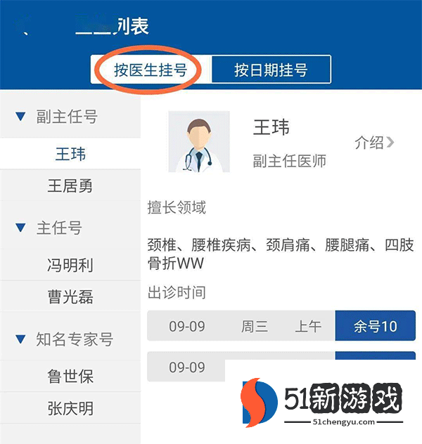 2、在“首页”点击“预约挂号”,选择科室后,进入“医生列表”,可按医生挂号;