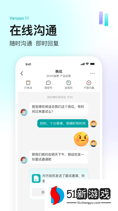 3、随时随地,直接开聊。聊爽就约 ,拍板快,入职快。