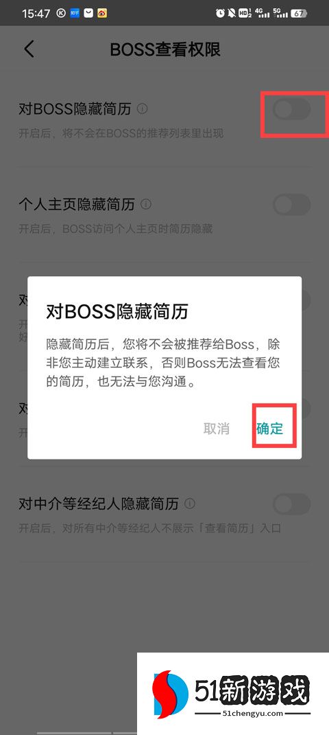 4、我们打开对boss隐藏简历或是个人主页隐藏简历,点击确定,即可隐藏自己的简历。