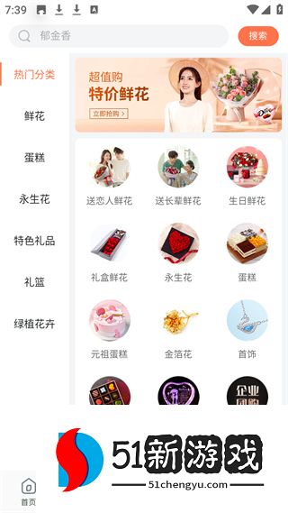 1、首页有鲜花蛋糕等分类,生日祝福等场景分类,展示送恋人长辈朋友花束,及热销榜特价专区等,满足鲜花礼品需求。