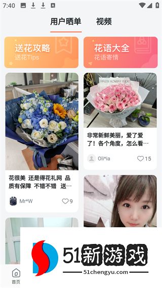 3、花现页,有用户晒单和视频板块,送花攻略花语大全,展示用户晒花及评价,为选花送花提供参考。