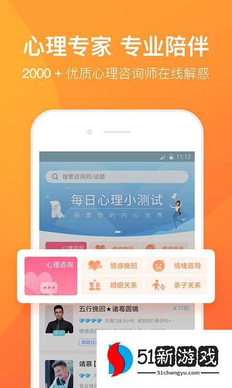 橙橙心理是一款受欢迎的在线心理咨询软件,拥有全新的心理咨询页面设计,用户可以轻松咨询专业心理师,轻松得到专业的解答和帮助,还能及时更新各种心理测试题库,随时随地自由进行心理检测,自由了解各种心理健康信息,能完全满足所有使用需求,还允许用户自由关注各种心理健康新闻和文章,可以在线阅读浏览,自由享受优质的心理治愈服务,随时帮助用户轻松释放心理压力,有兴趣的用户欢迎来本站下载软件。