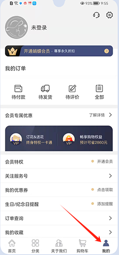 3、点击我的页面,含未登录状态、会员优惠、订单查询等功能,可管理个人购物相关信息。