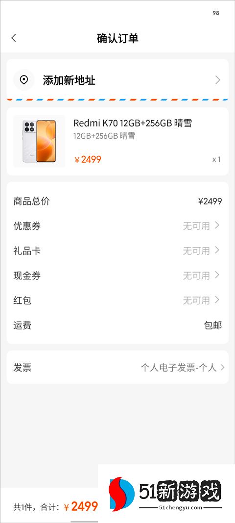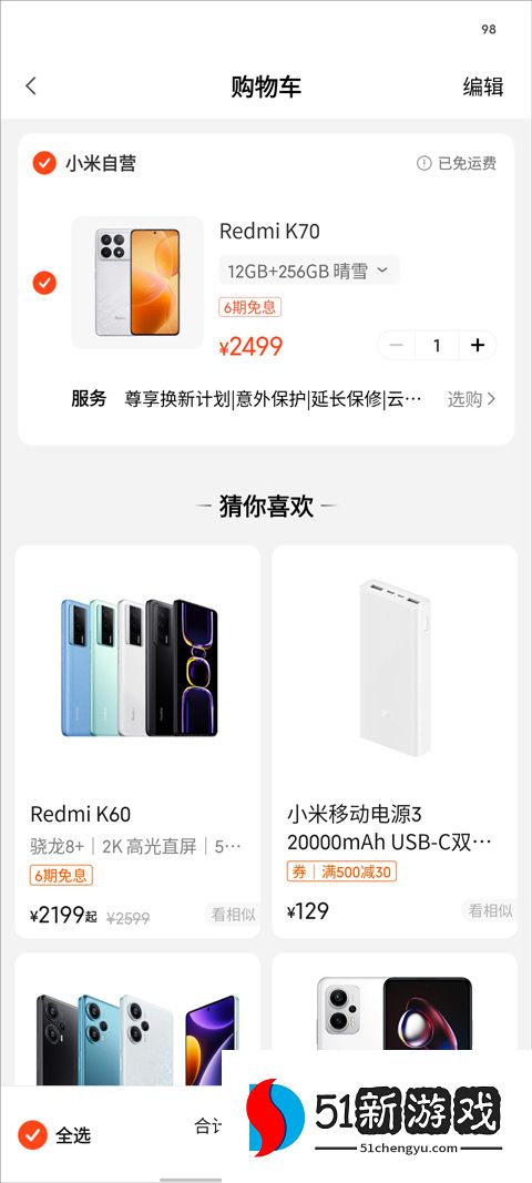 1、打开小米商城,将想要购买的产品加入购物车,以RedmiK70为例,点击结算。