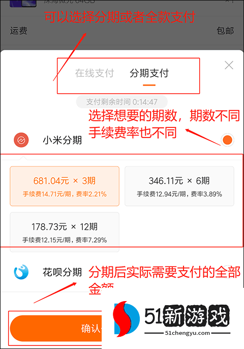 3、选择分期支付---然后选择小米分期或者花呗分期支付---选择对应分期数---然后点击确认付款即可,部分产品只支持花呗分期或者不支持分期,以商城页面显示为准哦。