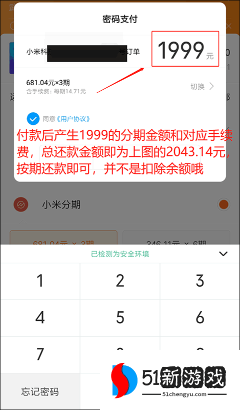 4、最后输入密码进行支付,这样就成功使用分期付款了。
