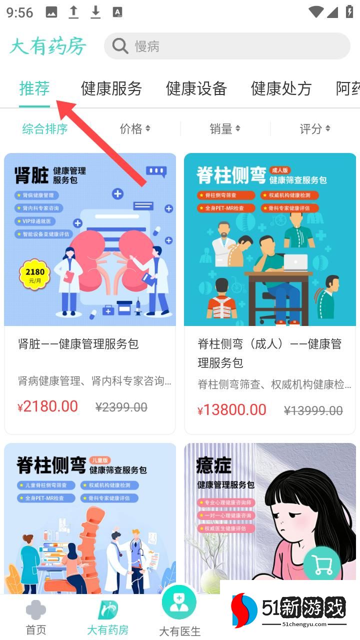 2、在大有医网页面上,展示了肾脏健康管理、脊柱侧凸筛查等服务包,包括专家咨询、健康检查等。标出价格和折扣,并提供疾病管理的定制选项。
