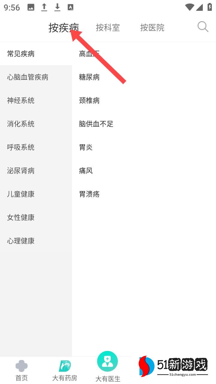3、疾病查询页面分类很好。左侧列出常见病、心脑血管疾病等,右侧则对应高血压、糖尿病等病症,方便用户快速查询疾病,获取专业的医疗咨询和健康知识。