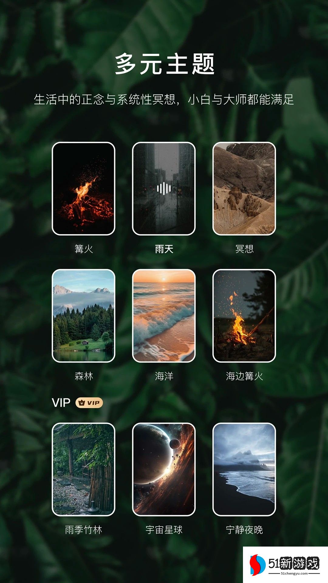 1、多种冥想场景可以满足不同的需求,让你在不同的情况下找到适合自己的冥想方法。