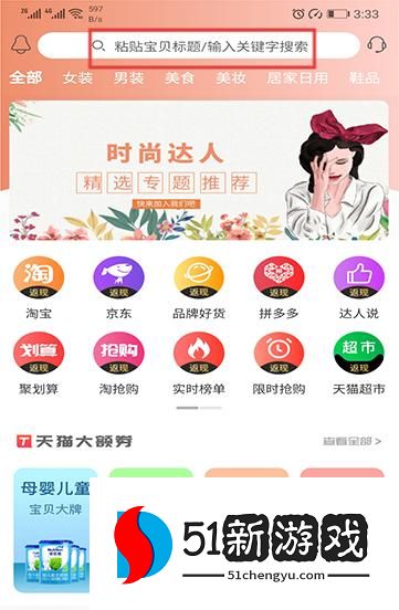 2、在顶部搜索栏粘贴宝贝标题输入关键词,检索对应商品优惠券。