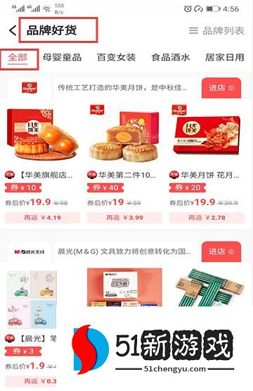 4、点击品牌好货入口,筛选分类如全部、母婴童品,查看品牌商品及专属优惠。