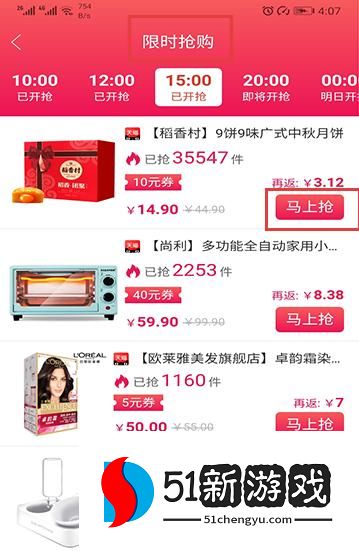 3、进入限时抢购专区,选择场次,点击商品马上抢,领取优惠券并下单。