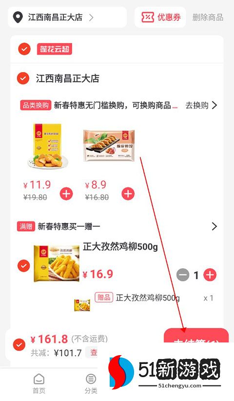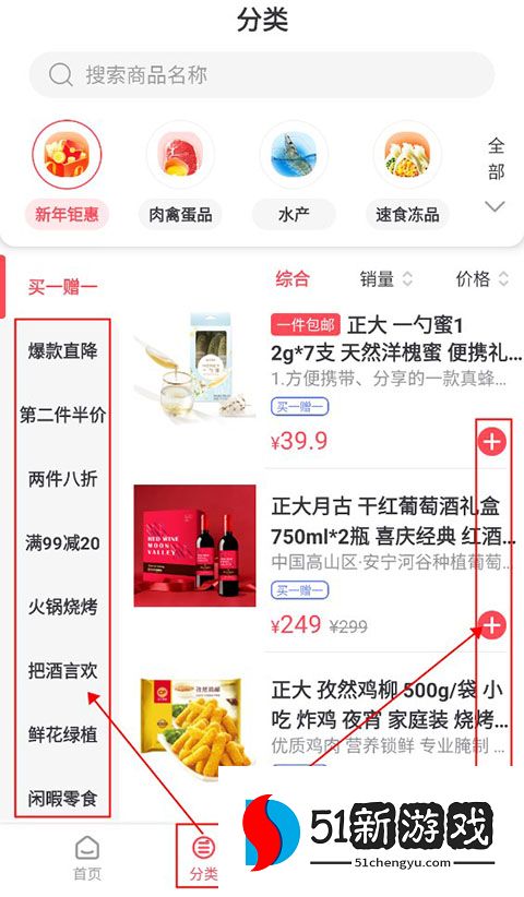 选择好门店之后就可以退出地址页面,点击下方的分类,进入分类购物页面,可以在左边选择自己想要的商品类型,然后点击右边的加号,将想要购买的商品加入购物车。