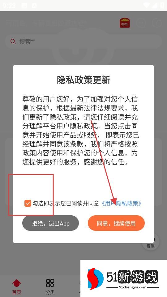 2、点击商品进入详情页,进入隐私政策更新页,勾选同意条款,点击同意继续使用。