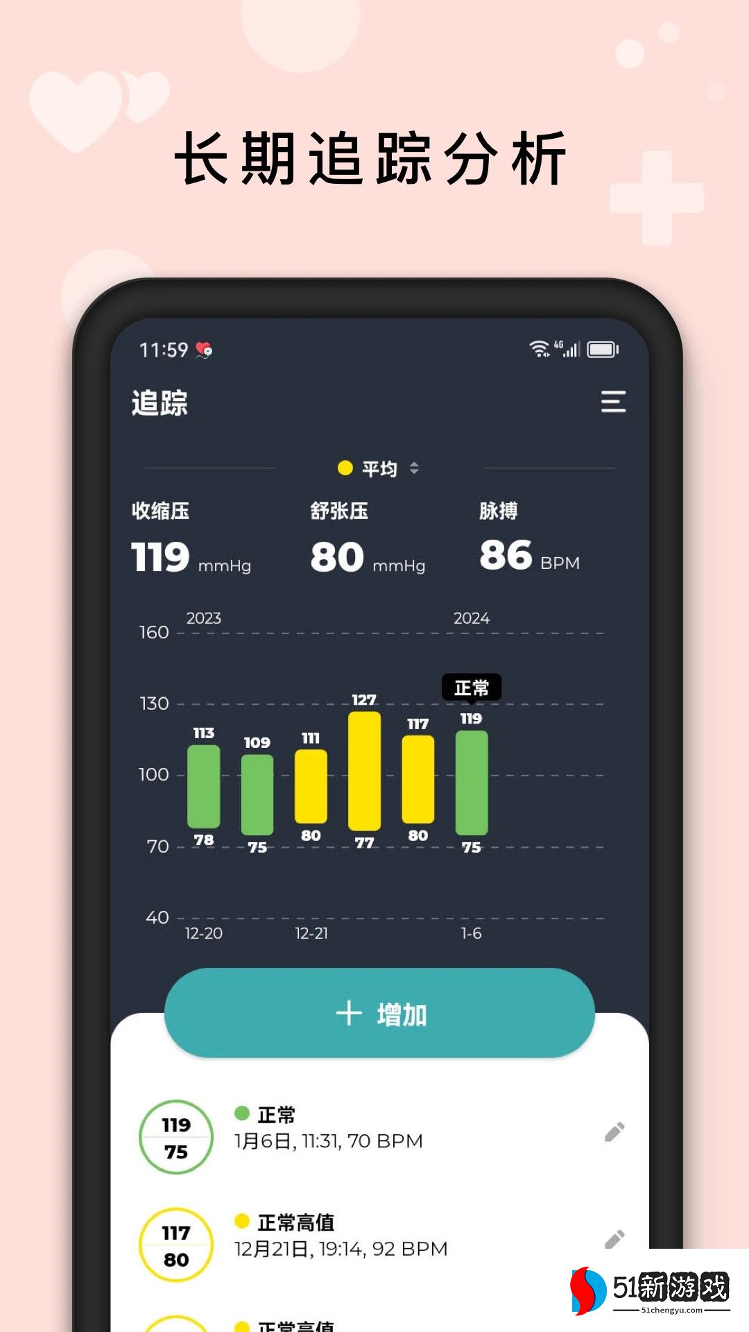 2、健康报告:提供详细的周、月、年报告,帮助用户分析长期血压趋势,为健康管理提供坚实的基础。