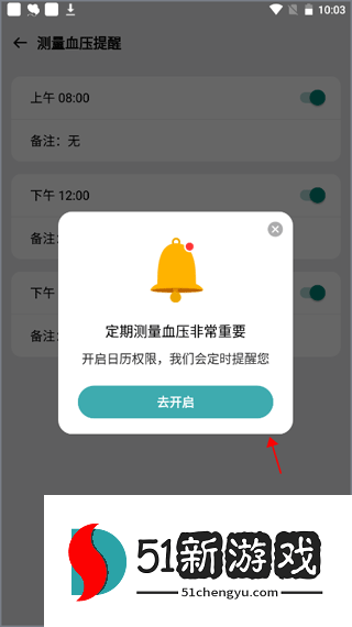 2、此时,将弹出一个小窗口。启用日历权限,让日历自动提醒我们测量血压。只要点击“去开启”就可以了。