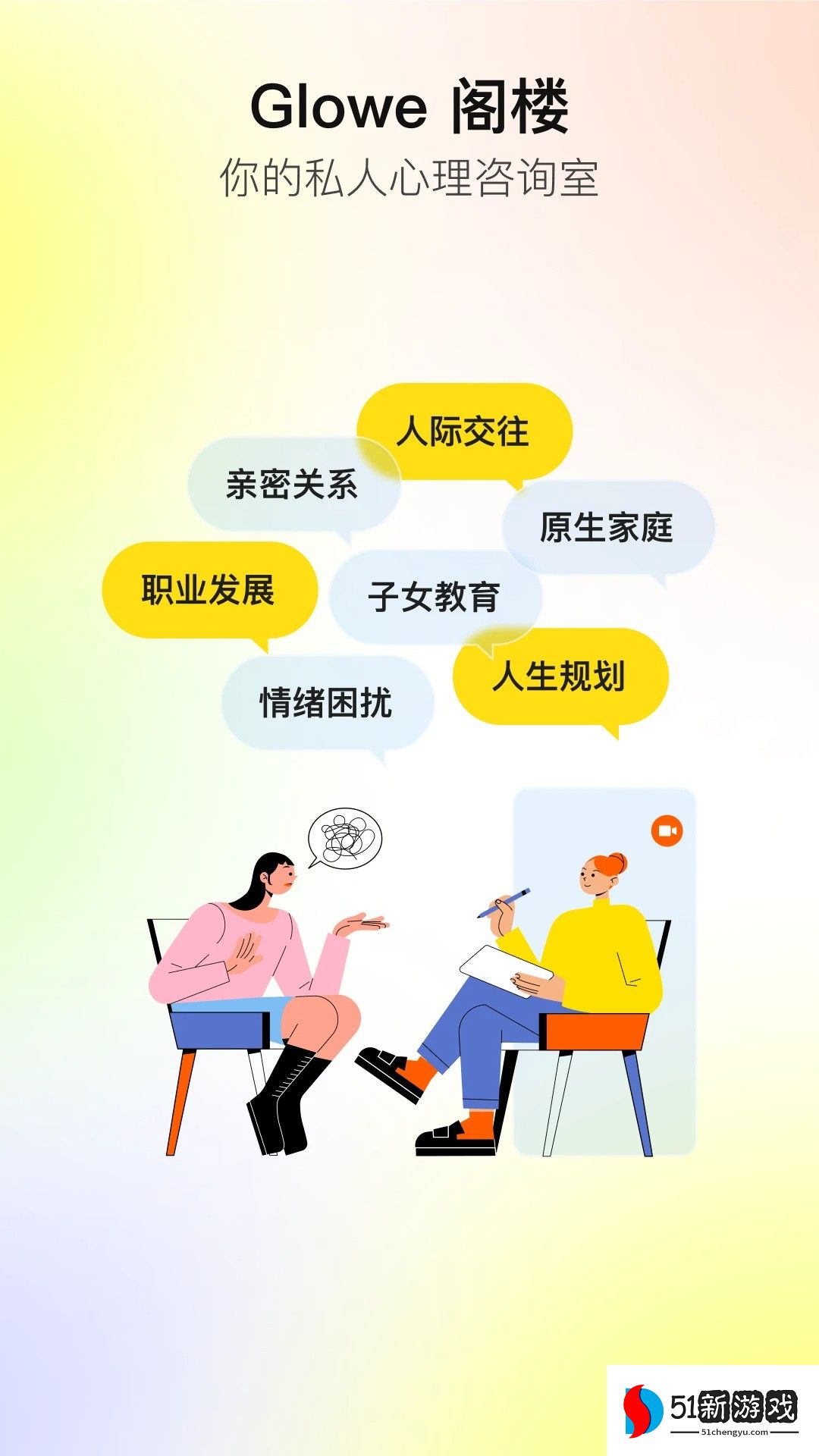 Glowe阁楼是一款热门的在线心理咨询软件,拥有大量的专业心理咨询师,可以让用户随时随地咨询各种心理问题,轻松了解各种心理健康状况,自由享受优质服务和体验,还提供全面的心理测试题库,允许用户自由选择练习,自由掌握全面的心理健康信息,能完全满足所有使用需求,还能直接进入私人心理咨询室,自由让用户享受简单舒适的心理咨询,轻松帮助用户释放更多的压力,有需要的用户欢迎来本站下载软件。