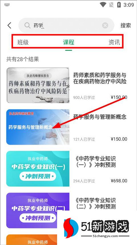 2、搜索关键字后,您可以查看相关的考试辅助课程、专业课程以及相关的新闻信息。点击班级/课程进入注册页面。