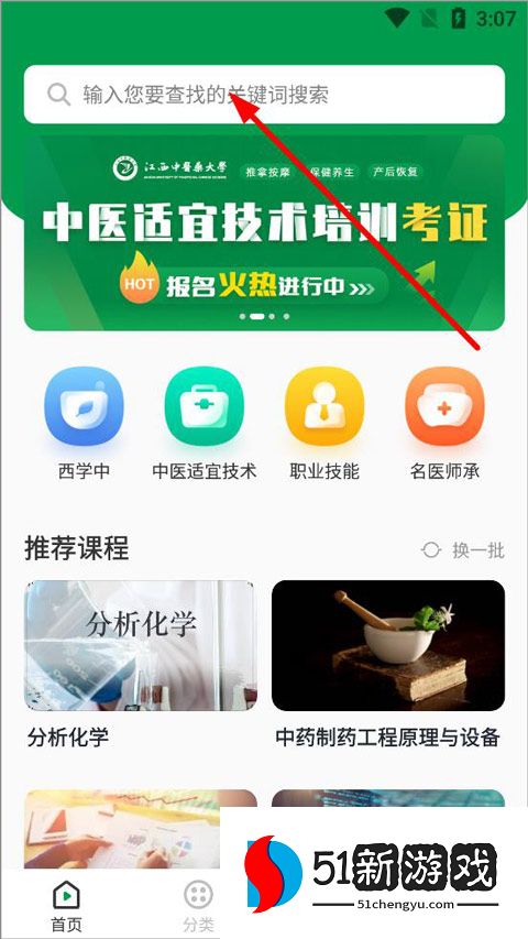 1、打开中医药在线app,注册登录。在主页上,你可以看到“西学中医”、“中医之道”、“职业技能”、“师徒传承”等栏目。也有推荐的学习课程。点击搜索框,输入关键词搜索课程。