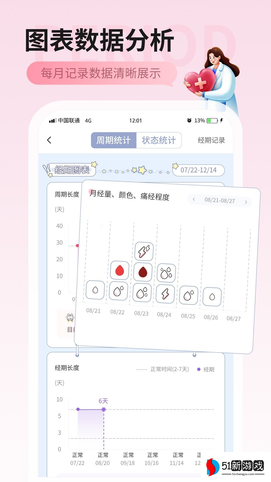 2、丰富的统计数据:提供各种统计图表,帮助用户直观了解自己的月经和身体状况。