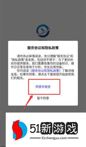 1、打开应用程序阅读服务协议,点击同意并接受进入主页。
