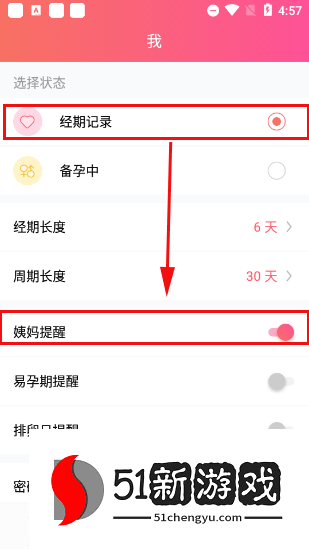 ② 准备怀孕:激活“阿姨提醒”、“轻松怀孕提醒”和“排卵提醒”。
